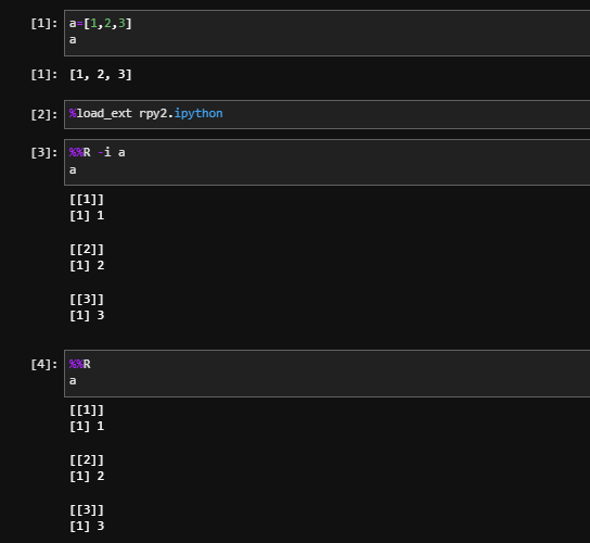 - 3번 cell: R을 연결하여 Python에서 생성한 list를 넘겨준 모습.