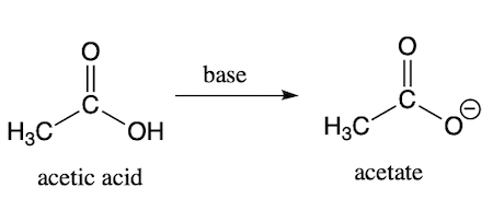 이때 acetic acid와 acetate처럼 서로 비슷한 이름이 보이는데, acetate는 acetic acid에서 수소 이온(H+)을 잃어버려서 negative charge를 띤 이온을 의미한다.