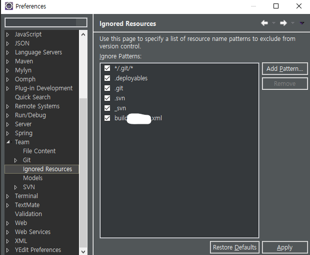 위의 상황에서 나는 새로운 build_new.xml을 만들고, Ignored Resources에 build_new.xml을 추가했다. 그리고 기존의 build.xml은 그대로 두고, build_new.xml만 수정해서 사용하면 commit에서 무시된다.
